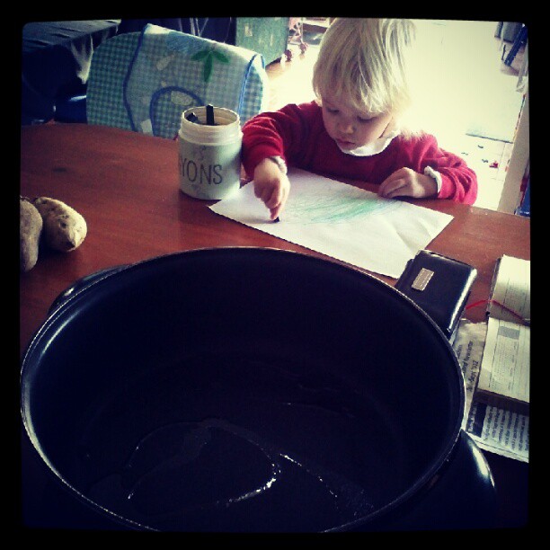 Multi-tasking starts young - watching Mummy cooking dinner AND drawing a picture for Daddy!