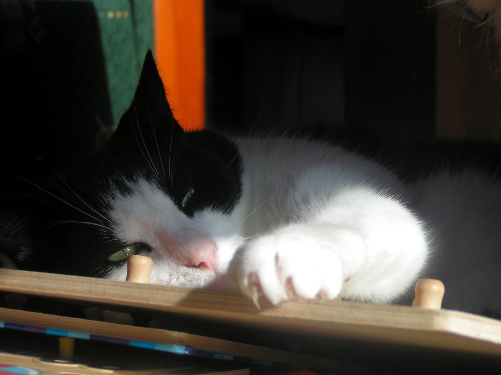 * The cat found a perfect spot in the sun - on top of Button's puzzles, which live under the coffee table (until the toddler discovered her):