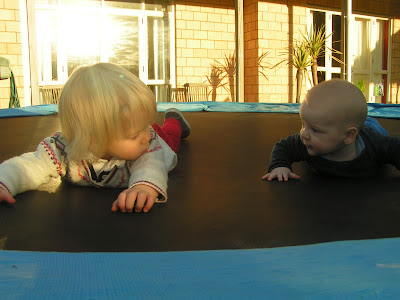 'lil M's first go on the trampoline... he loved being outside with us all, and dotes on his sister!