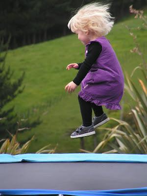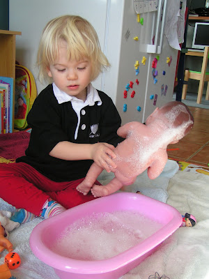 * This week we have done loads of jumping on the 'pampapeen' when it wasn't raining (used to say trampoline properly, but no more), and done some waterplay - with Ruby having a bubble bath: