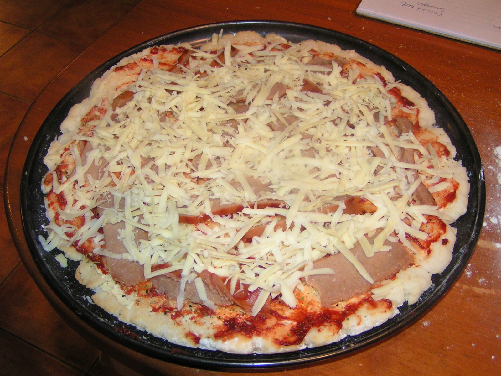 - Coat with toppings of your choice, we tend to keep it fairly simple with just a layer or two of meat (depending on what is available), and cheese! But don't be shy - go ahead and just do what works for you here...